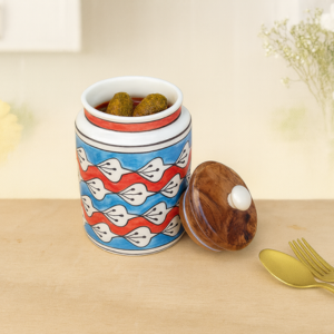 Bring a touch of vibrant elegance to your kitchen with this beautifully hand-painted ceramic storage jar. Featuring intricate blue floral artwork paired with warm yellow accents, this piece blends traditional charm with modern functionality. The natural wooden lid adds rustic character while keeping your contents fresh. ✨ Key Features Premium Hand-Painted Ceramic: Durable, glossy, and crafted with detailed floral artwork. Natural Wooden Lid: Smooth, sturdy lid with knob handle for easy grip. Airtight Seal: Helps preserve flavor and freshness of dry goods. Vibrant Floral Artwork: Blue flowers and yellow leaves add a lively, decorative appeal. Multi-Purpose Storage: Ideal for tea, coffee, sugar, cookies, spices, snacks, or even decorative use. Perfect for Gifting: A thoughtful choice for housewarmings, festive gifts, or special occasions. 📏 Specifications Material: Ceramic jar + Wooden lid Design: Blue floral pattern with yellow leaf accents Finish: Smooth, glossy exterior Usage: Dry storage for kitchen essentials Care Instructions: Hand wash recommended; keep lid dry Capacity: [capacity, 900 ml] Care: Easy to clean; hand wash recommended Why You’ll Love It: This jar combines functionality with artistry — ideal for modern and cozy kitchen spaces. It also makes a thoughtful gift for housewarmings or festive occasions.