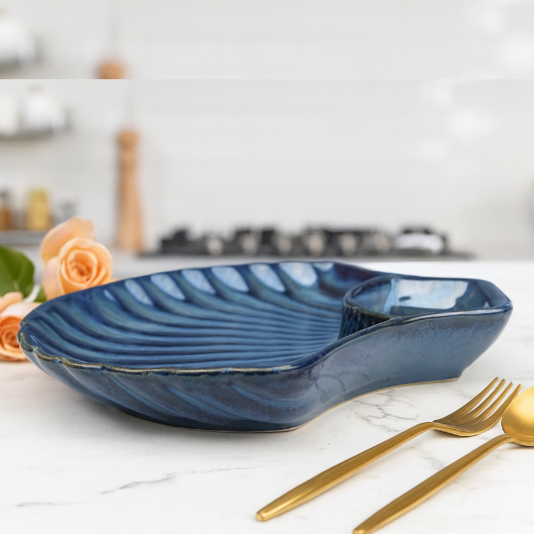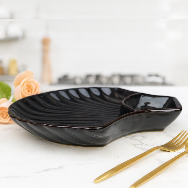 Serve in style with this elegant handcrafted black ceramic serving platter, thoughtfully designed in a shell-inspired shape with an integrated dip bowl section. The sleek matte-black finish and ridged texture make it a statement piece for any modern dining table. Perfect for both casual gatherings and formal occasions.