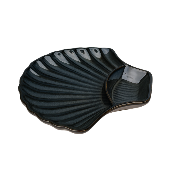 Handcrafted Black Ceramic Shell-Shaped Serving Platter with Dip Bowl