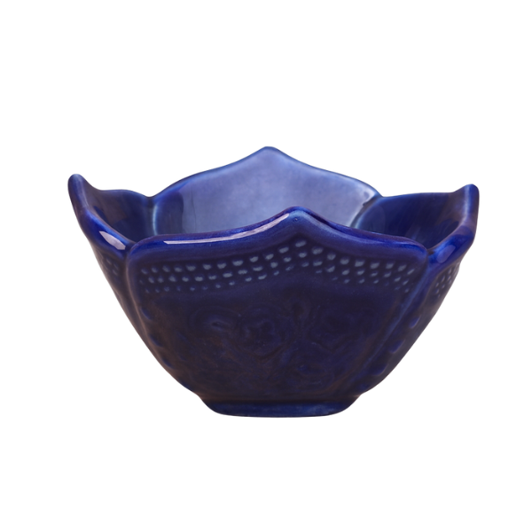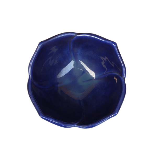 This thing looks really nice because it is shaped like things you find in nature. You can use it as a bowl for serving food. It will look great on a table or on some open shelves. The color of this bowl is a blue that reminds you of water. It is made of ceramic. Has a smooth finish, which makes it look really calm and fancy at the same time. The lotus bowl will fit in with lots of kinds of rooms, like modern rooms, contemporary rooms and traditional rooms. The blue tone of the lotus bowl is very soothing. It has a smooth glazed finish.
