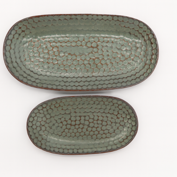 The contemporary, elongated oval form provides a perfect background that can be used to serve appetizers, main courses, dessert, or snack dishes, while a textured finish brings a sensory dimension that is complemented by a natural, dark green glaze that exudes a rich, elegant look with nuances of color. Such a combination of form, texture, and color puts this serving platter in a league that makes it a distinctive piece among high-quality tableware sets, complementing serving bowls with ease.