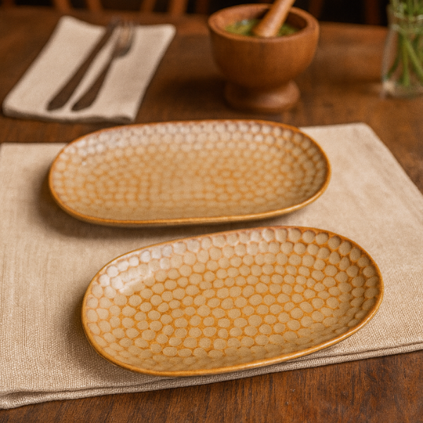Add sophistication and natural color to your tabletop decor with the Handcrafted Green Textured Ceramic Serving Platter – Oval, a modern and ornate serving dish. The Handcrafted Green Textured Ceramic Serving Platter – Oval is a culmination of craftsmanship and modern design and has been created through painstaking efforts and traditional methods of ceramic craftsmanship passed down through the centuries in the tradition of Khurja pottery.