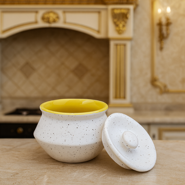 Introduce functional elegance and artisanal contrast to your space with the Handcrafted Speckled White Ceramic Jar – Mustard Yellow Interior, Set of 2, a refined storage duo designed to balance everyday utility with design-led aesthetics. Meticulously crafted to retain the essence of traditional handmade ceramic techniques, the jars draw heavily from the rich heritage of Khurja-a region renowned for its mastery in handcrafted ceramics.